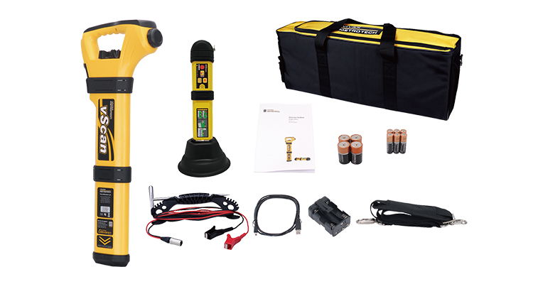 ชุดอุปกรณ์ระบุตำแหน่ง vScan มาพร้อมกับกระเป๋าผ้าใบขนาดใหญ่ที่ใส่เครื่องรับ เครื่องส่ง สายนำ และอุปกรณ์เสริมอื่นๆ ได้